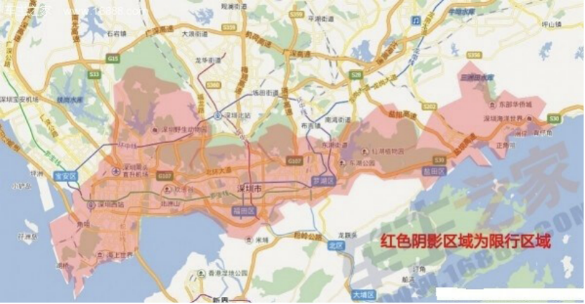 以下红色阴影区域为限行区域